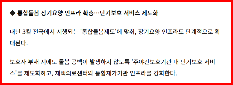 돌봄이 필요한 어르신이 집과 같은 환경에서 안심하고 지낼 수 있도록, 서비스 질을 높이고 인프라를 확대함으로써 초고령 사회에 걸맞은 복지 체계를 갖추겠다는 것이 이번 개편의 핵심입니다.