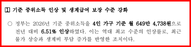2026년 기준중위소득은 4인 가구 기준 649만 원으로 확정되며,