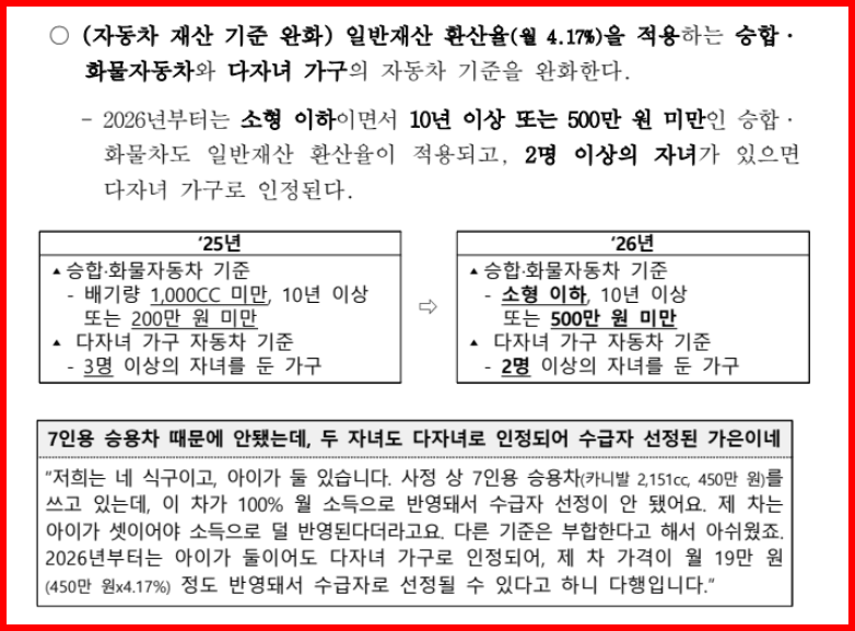 2026년부터 자동차 및 재산 기준이 완화됩니다. 특히 다자녀 가구, 생계형 차량(승합·화물차)은 기존보다 낮은 환산율(월 4.17%)이 적용되어 수급 자격을 유지하기 쉬워졌습니다.