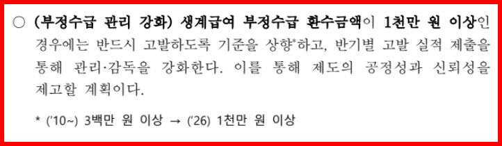 정부는 부정수급 방지를 위해 고발 기준 금액을 300만 원 → 1,000만 원 이상으로 상향했습니다.