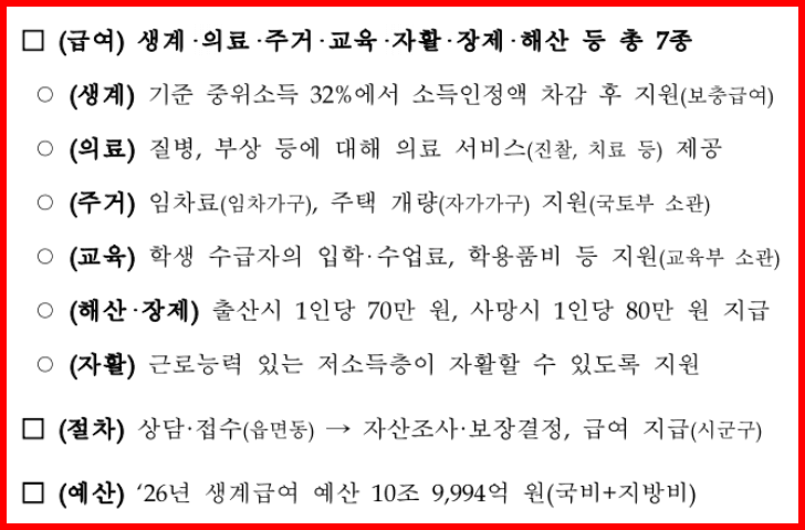 보건복지부는 2026년 1월 1일,기초생활보장제도의 기준중위소득 인상과 함께 생계급여·의료급여 등 주요 복지급여의 지원 기준을 전면 조정한다고 밝혔습니다.