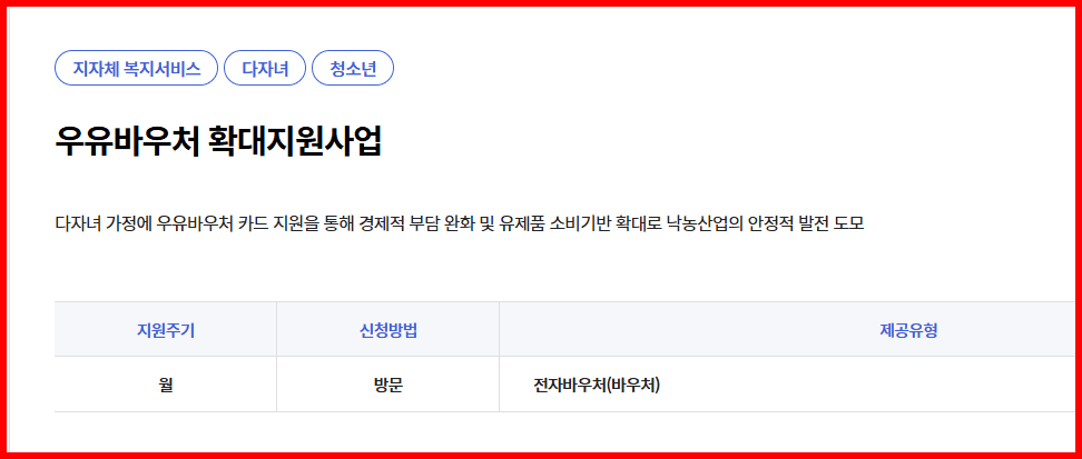 - 지원대상: 기초생활수급자, 차상위계층, 한부모·다문화 가정의 영유아